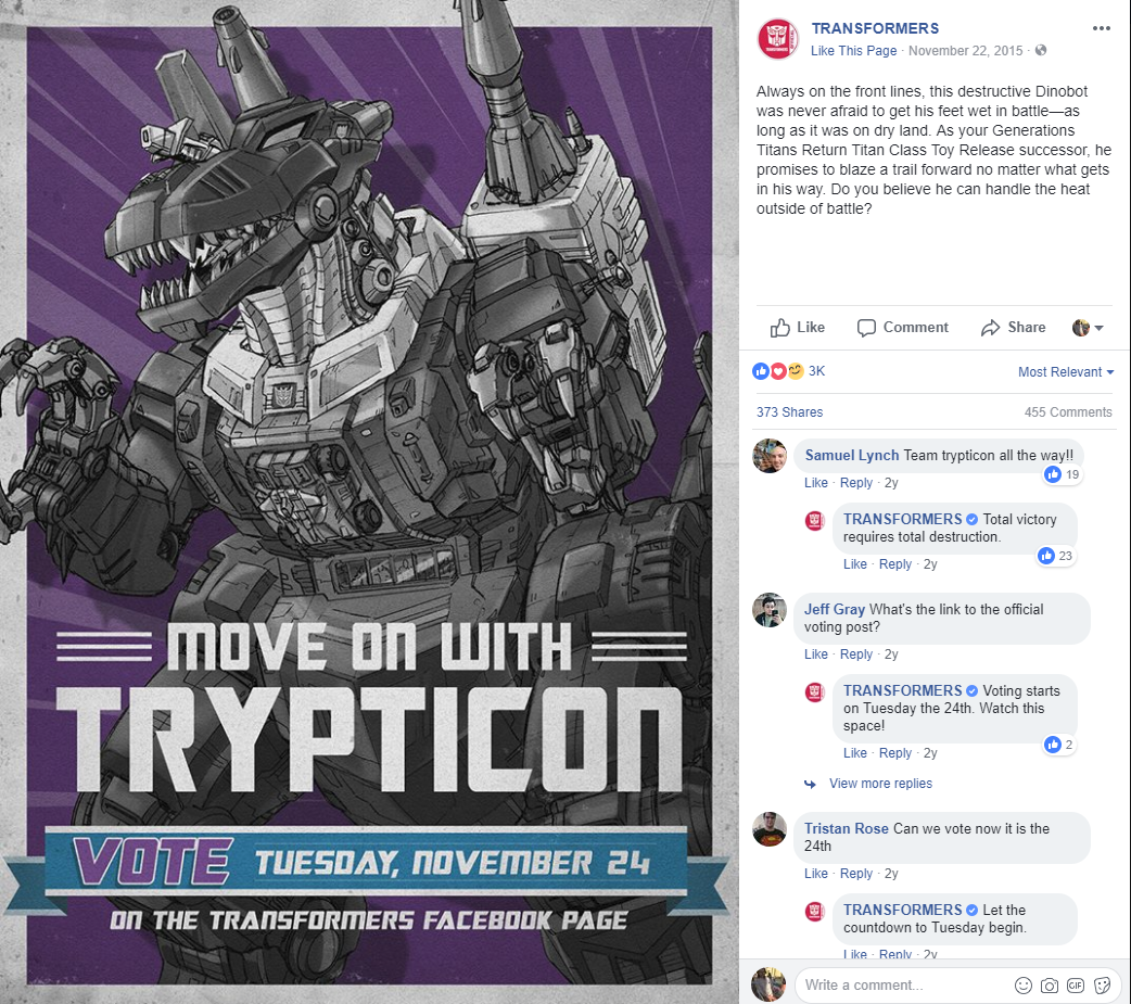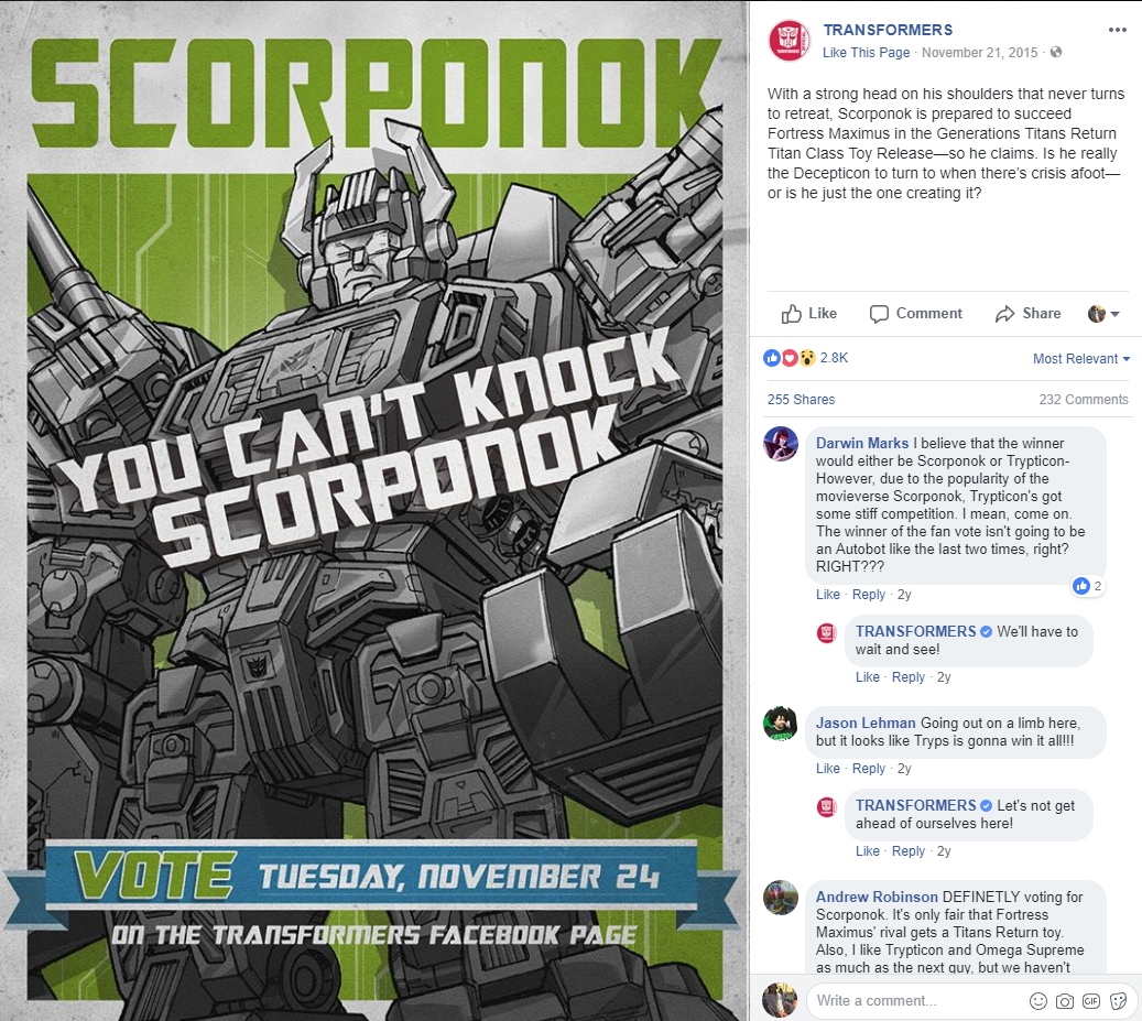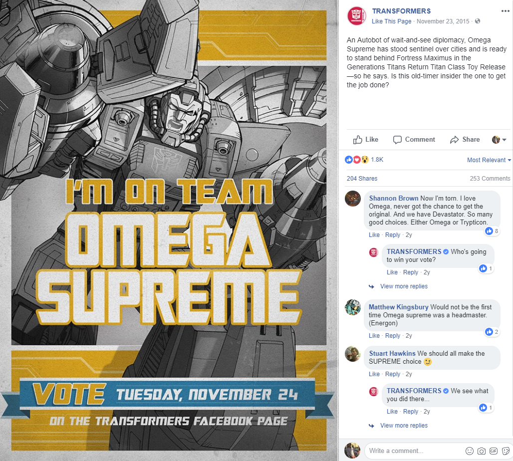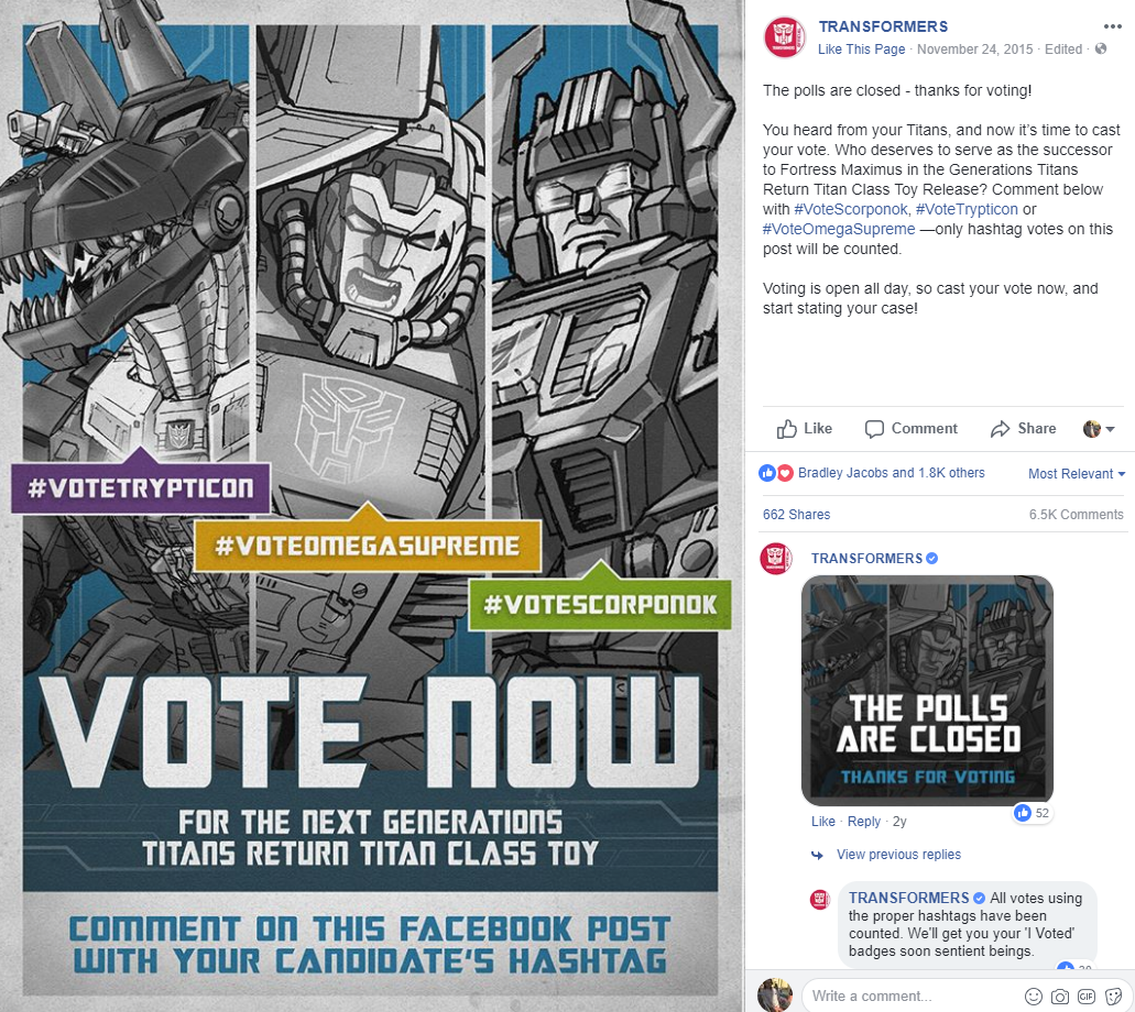 The Transformers Facebook page is home to a very active and vocal fan base. We were tasked with tapping into that enthusiasm for a first-of-its-kind vote to determine the next Titans-scale toy. A visual for each prospective character was created in a campaign-style, while supporting copy made their case through deep references to the lore.